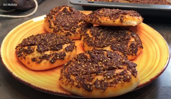Önce iç harcımız için zeytinyağda soğanları kavuralım salçaları ekleyip kavurmaya devam edelim peyniri baharatları susamını ve suyunu ilave edip 2-3 dk kavurmaya devam edip soğumaya bırakalım . Hamuru için su süt maya şekeri yoğurma kabına alıp hafif karıştıralım yağını ekleyip kontrollü olarak ununu ve 1 tatlı kaşığı tuz ilavesiyle ele yapışmayan yumuşak hamur yapalım ve 1,5 saat mayalandıralım . Mayalanan hamurdan 18 adet beze yapıp tepsiye dizelim hamurları elimizle hafif büyütelim soğumuş olan üst malzememizden her hamura 1 ‘er yemek kaşığı koyup güzelce yayalım ve önceden ısıtılmış 200* lik fırında kızarana kadar pişirelim. yapıp deneyenlere şimdiden afiyet olsun. mutlaka denemenizi tavsiye ederim.