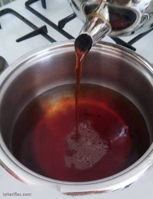 Kaynattığımız suya enfes şekilde demlediğimiz kara çaydan bir buçuk çay bardağı kadar ekleriz.