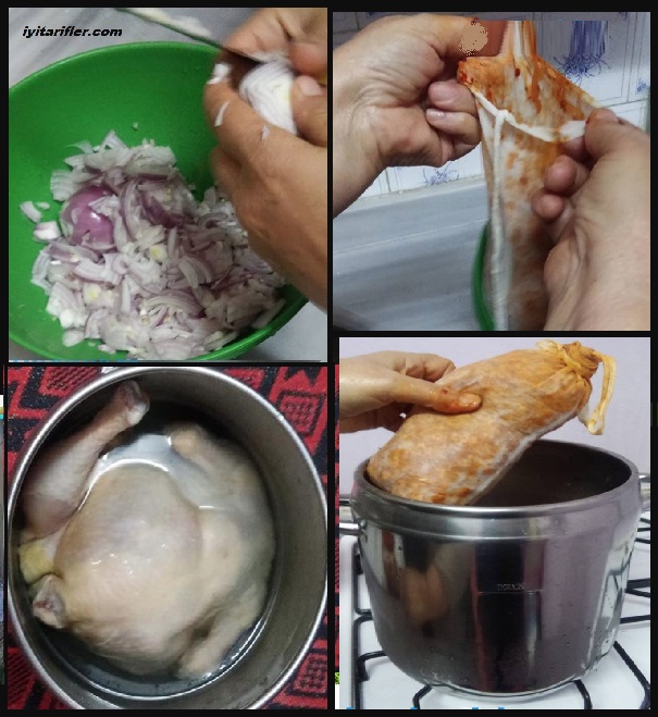 Ellerimizle soğanları ezmeden torbaya yerleştirir ve soğan kesesinin ağzını güzelce bir düğümleriz.Artından tavuğumuzu düdüklü tencerenin içine koyar ve 1 litre su koyarız